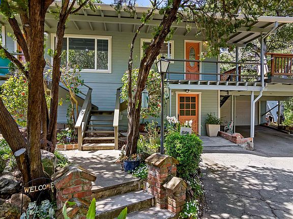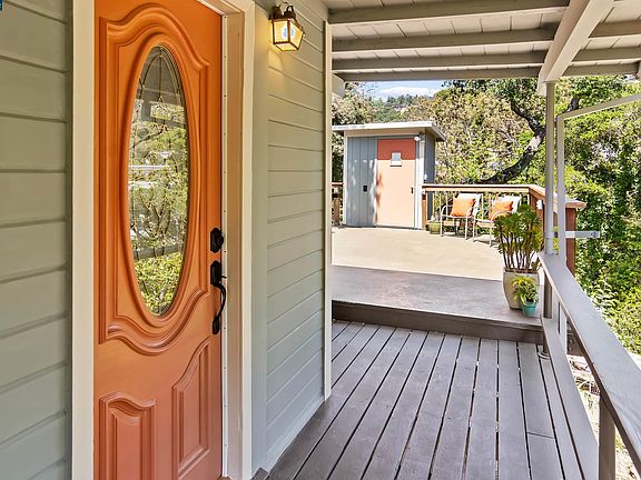 One of a kind .85 acre gated oasis at the base of the Oakland hills. The sylvan setting of mature oaks, numerous fruit trees and beautiful wildflowers and native grasses will capture your heart. Classic home built in 1925 features gorgeous hardwood floors with inlaid compass design and abundant natural light with views of surrounding trees. The primary bedroom is located on the main level with kitchen and living room. A spiral staircase leads to two downstairs bedrooms and laundry. At the rear of the home, you’ll find a separate one bedroom apartment with private entrance and full kitchen, living room and bathroom. Additional features include a small building in the backyard ideal for art studio, workout room or office and an underground bunker perfect for a wine cellar (or repurposed with your imagination). The detached garage offers additional storage. You must visit this home at the height of the spring season and walk these magical grounds to let the land speak to you.