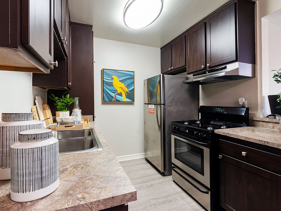 - Exterior features: , 24-Hour Emergency Maintenance, Balcony, Barbecue, Breakfast Bar, Complementary Daily Coffee Bar, Flooring: Wood, Lush Landscaping, On-Site Maintenance, On-Site Management, On-Site Parking, Online Rent Payment, Outdoor Seating with Atmosphere Lighting, Package Receiving, Planned Events and Activities for Residents, Plush Carpeting, Print & Connect, Shaker Style Cabinets, Single-Story Floor Plans, Stainless Steel Kitchen Appliances