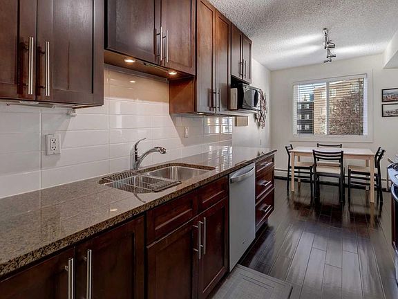 YABBA DABBA DOO! Welcome to an immaculate two bedroom, one bath condo offering 870sf of bright and inviting living space. The hardwood flooring creates a modern and stylish feel. The kitchen is equipped with all the necessary appliances, complemented by granite countertops for a sleek and functional cooking space. The spacious living area is flooded with natural light from large windows and provides access to a sun soaked balcony perfect for relaxing or entertaining. Both bedrooms offer generous space with floor-to-ceiling mirrors and large closets, providing ample storage while enhancing a bright and airy feel. The bathroom is larger than most, while the in-suite laundry adds that ultimate convenience. A large storage room off the hallway will provide extra space for all your essentials. This home comes with one assigned parking stall with electric hookup for your car engine block heating. Pets are welcome here with the approval of the Condo Board. Located in the centrally located quiet Greenview community, offering quick access to off-leash dog parks, scenic biking paths and major transportation routes such as Deerfoot Trail, McKnight Boulevard and Centre Street. Shopping, dining and other amenities are within easy reach. Deerfoot City, Superstore and various local shops just a short walk/drive away. Not to mention that quick access to downtown, the airport and mountains makes this location unbeatable! This move-in-ready home is a fantastic opportunity for first-time buyers, downsizers or investors. Priced to sell!