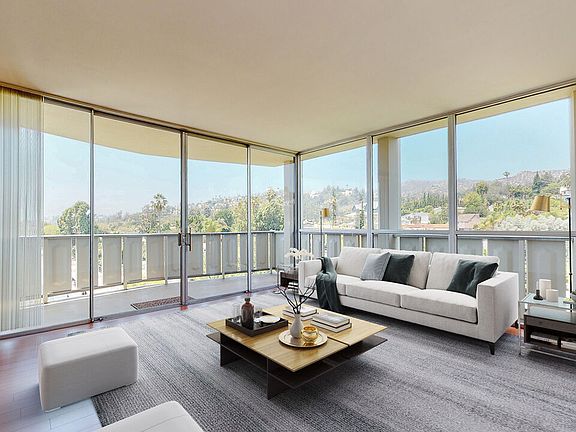 Experience Manhattan style living in the heart of Los Feliz. This mid century high rise has everything to offer! This bright and spacious corner unit is steps away from local restaurants and shops, Griffith Park hiking trails, the Greek Theatre, and more. Step inside to take in the light and sights. The formal entry leads to an open concept floor plan featuring a large living room, dining area, kitchen and breakfast bar. Floor-to-ceiling windows in the living area open into a generous balcony, a space that invites relaxation and/or al fresco dining options. Panoramic views of the city lights, Griffith Observatory, and Los Feliz hills truly creates the indoor/outdoor lifestyle that is quintessential to LA living. An oversized primary suite is perfect for unwinding after a long day. Another sizable bedroom is great for general living space or the perfect at home office. Building amenities include 24-hour security and doorman, two secure parking spaces, a fitness center, heated pool w/ sun deck, sauna, and rec room. Water, trash, and Spectrum cable package included as well. Available for immediate occupancy. Come make this your own!