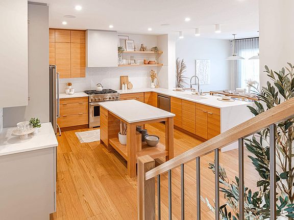 Warm wood detailsStainless steel appliancesGas stoveElegant two-tone cabinetryTile backsplashInviting islandBeautiful fireplace