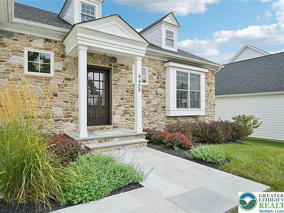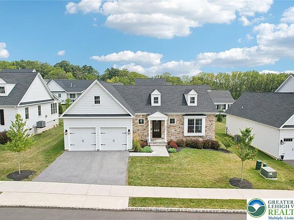 Welcome to this single family home situated on a premium lot in the 55+ community of Cottages at Old Saucon with over $190k worth of upgrades. Designed for effortless living and upscale comfort, this home boasts premium finishes throughout. Enter from the covered front porch into a spacious foyer that opens seamlessly into the heart of the home. The open-concept main living area is filled with natural light and features a vaulted ceiling. At the center of it all, the gourmet eat-in kitchen showcases Quartz countertops, high-end stainless steel appliances, a large island with seating, buffet bar and a pantry. The adjacent dining area comfortably accommodates family and guests and flows into the warm and welcoming living room with a cozy fireplace. French doors lead to a spacious rear paver patio, complete with a retaining wall, offering a peaceful outdoor retreat. The primary suite is privately situated on one side of the home and features a luxurious ensuite with a dual vanity, glass-enclosed walk-in shower, and a water closet. Two additional bedrooms are located on the opposite side of the home, sharing a well-appointed full hall bath. A convenient half bath and laundry room with mudroom area provide easy access to the attached 2-car garage, which features refinished floors. The expansive full unfinished basement offers endless potential and includes rough-in plumbing for a future bathroom. Located just minutes from the Saucon Valley Country Club and the Shops at Old Saucon.
