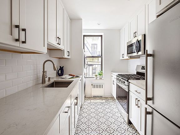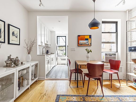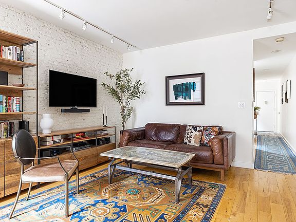 Nestled on a picturesque tree-lined street in the heart of South Slope is this spacious and beautifully renovated two-bedroom home in a classic, bay-front Limestone just half a block to Prospect Park. When you enter, via a single flight of stairs, you are greeted by a windowed foyer and hallway, offering the perfect backdrop for showcasing your art collection. The hallway leads to an open living and dining room graced with high ceilings and charming exposed brick. Directly ahead is the brand new windowed kitchen featuring white cabinetry, quartz counters, decorative floor tile, new appliances, and a stacked washer/dryer discretely tucked away. The seamless flow between the living area, dining space and kitchen create an ideal layout for entertaining and still being part of the action.
