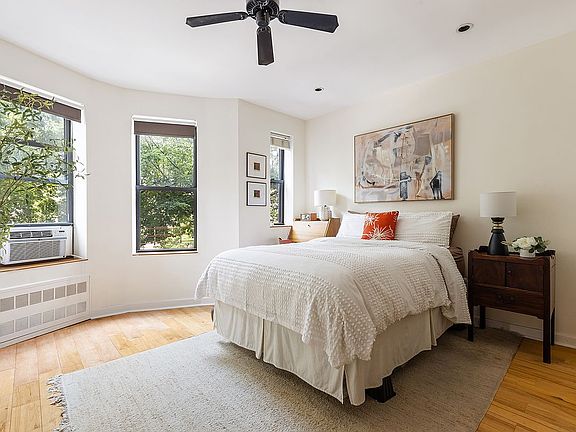 Returning down the hall, you’ll discover the also newly renovated windowed bathroom with an ingenious, extra-wide dual sink and modern glass shower doors. The vanity and triple-door medicine cabinet offer ample storage for all of your essentials. Next you come to the adorable second bedroom with its own well organized closet and space saving pocket doors. Finally you reach the airy and spacious primary bedroom featuring three large windows overlooking leafy 15th Street complemented by a generous walk-in closet. Every room in this home has ample proportions and an abundance of windows, allowing for refreshing cross-flow and optimal functionality. There are wide-plank maple hardwood floors throughout and convenient ceiling fans in the main rooms. Extremely low maintenance is the cherry on top of this affordable home.