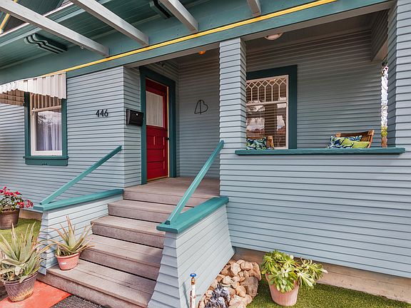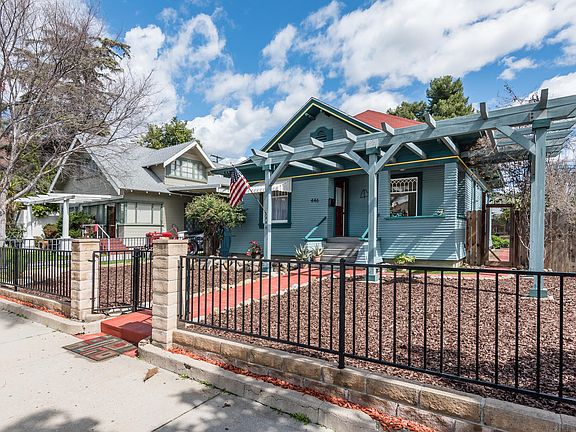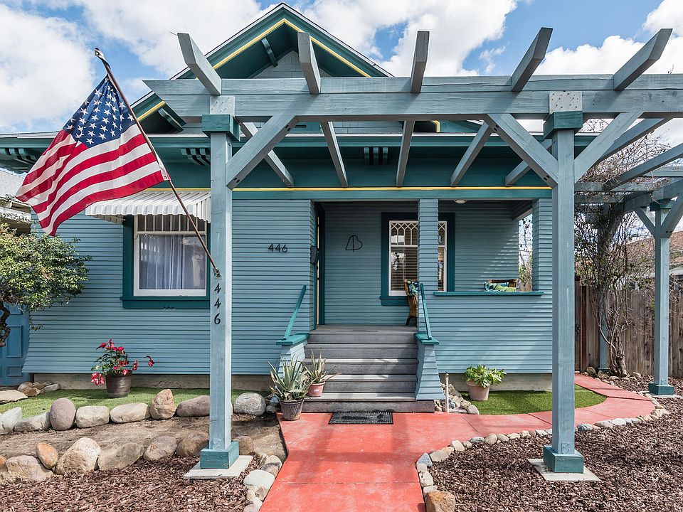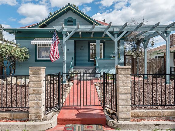 Craftsman Bungalow at its Best in Historical town. This home will take you back in time with charming & unique original features. Beautiful hardwood floors gorgeous front windows with criss-cross panes in the upper portion. Living room & formal dining room have beautiful hardwood floors & wall moldings. High ceilings, FD with breakfast bar looks into the kitchen. Lovely garden window. Kitchen with white shaker cabinet doors, Center Island w/breakfast bar, lots of cabinets space, pot rack above the island, beveled glass door to the back patio & lovely additional breakfast bar with a view of the inspiring backyard. Perfect artists hideaway. Just some of the many surprises that set this home apart are: The multipurpose garage is currently staged for a Music/Rec room with built in cabinets, a private bath and a lovely screened in patio to enjoy the quite evenings with the sound of the waterfall and fountain in the lovely coy pond. A glass of wine and a cheese platter will complete this wonderful experience after a long day of work. While relaxing, watch the little ones play in the sandbox or in the Treehouse & keep the chef company while the dinner is getting ready on the BBQ. For fun weekend entertainment use the putting green in the back and dine El Fresco under a covered patio with a view of your tranquil and relaxing property. The yard is studded with many fruit trees such as Navel and Valencia oranges, Apricot, Plum and Lemon. Possible future ADU in garage - WELCOME HOME