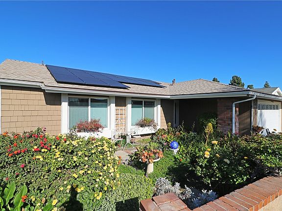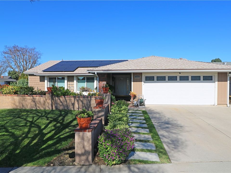 Huge energy cost savings in a highly desirable neighborhood! A fully owned solar system and new roof were installed in 2021, and many other upgrades and remodels have already been done for you. The functional floorplan maximizes the living space and flows extremely well from room to room. As you walk through the front door you are welcomed by the formal entry and spacious living room. Vaulted ceilings and an abundance of windows provide an open feeling with tons of natural light and a great view of the beautiful backyard landscaping and pool. Newer engineered bamboo flooring flows throughout the living area and into the spacious primary bedroom. Adjacent to the living room is the generously sized kitchen and dining area. The kitchen has been upgraded with granite counter tops and backsplash, tile flooring, crown molding, and 2 ceiling fans. Both bathrooms have matching remodels with tile shower/tub enclosures, tile flooring, tile wainscot, and Bluetooth mirrors with speakers. The guest bathroom also has been upgraded with a newer vanity. Both guest bedrooms are generous in size and feature bamboo flooring and a fantastic view of the front courtyard landscaping. The first guest bedroom, located near the living room, has double doors and would make a great home office, den, or entertainment room. The spacious primary bedroom features an abundance of closet space, mirrored closet doors, and an upgraded sliding glass door which leads to the resort-like backyard. It features a swimming pool, spa, and raised brick planters with lots of lush landscaping that has been immaculately maintained. There is plenty of additional room for an outdoor patio table or pool furniture, and the lot features a wide side yard on one side of the home. Other upgrades include dual pane windows, a QuietCool whole house fan, a WaterBoy whole house system, central A/C, and block walls on all three sides. Wall-mounted TV brackets have already been installed over the fireplace in the living room and in the primary bedroom. The home is located on a prime, corner lot within the neighborhood. It has convenient access to the 91, 55, and 57 FWYs, and there are lots of shopping and dining options along Tustin St. It is also walking distance to the Santa Ana River biking and walking trails, and near Eisenhower Park.