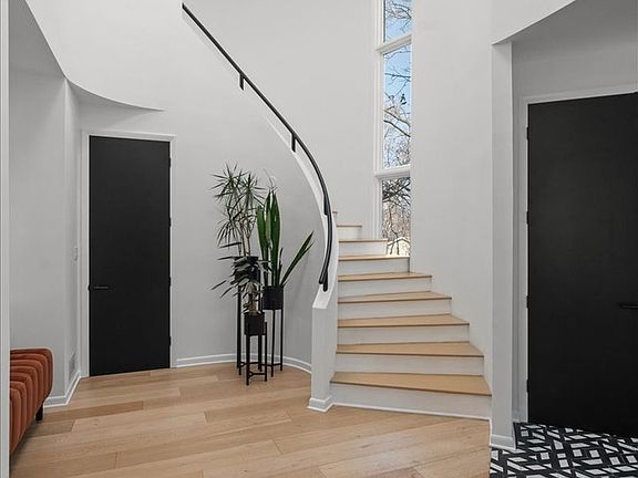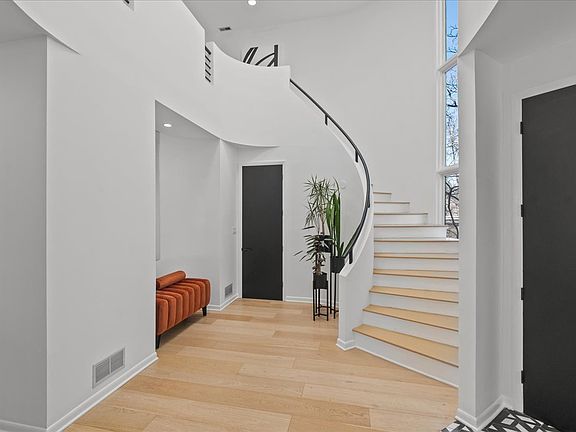 This 4+1 bedroom, 4.1-bath contemporary home beautifully blends modern style with thoughtful updates. The layout is designed for both comfort and function, beginning with a striking foyer where a sweeping curved staircase serves as a stunning focal point. The foyer flows into the inviting living room and dining room, creating a seamless transition between spaces. A bright eat-in kitchen, with white cabinetry, stainless steel appliances, a new tile backsplash, and double wall ovens, opens to the family room, where a vaulted ceiling and dramatic two-story fireplace with open-shelved built-ins create a stunning focal point. A private ensuite bedroom on the first floor offers flexibility for guests or multi-generational living. Upstairs, the large primary suite includes a private roof deck, while well-sized secondary bedrooms provide generous space and versatility. The finished lower level enhances the home's functionality, offering a rec room or fifth bedroom, a full bath, a sauna, and laundry. A Trex deck off the family room extends the living space outdoors, perfect for relaxing or entertaining. A two-car garage plus covered parking for two additional vehicles ensures ample space for storage and convenience. Recent updates elevate the home's appeal, including new wide-plank light oak flooring throughout most rooms, a refreshed family room with a remodeled fireplace and built-ins, updated secondary bedrooms, and a crisp white-painted interior for a bright, cohesive aesthetic. The main and balcony roofs are newer, and about half of the windows, including the two largest bay windows, were replaced by the previous owner. The exterior stucco was recently inspected and remains in excellent condition, and the basement furnace was replaced in 2019.