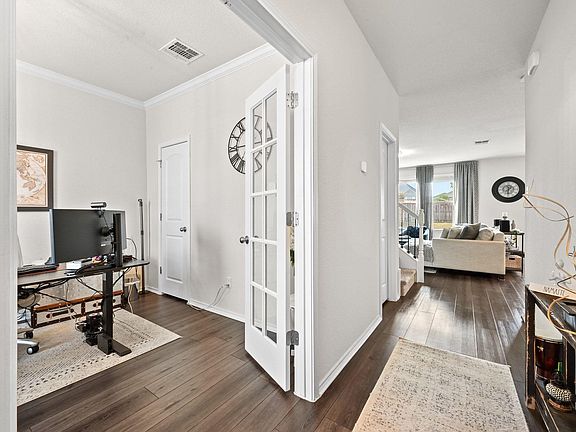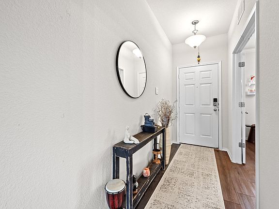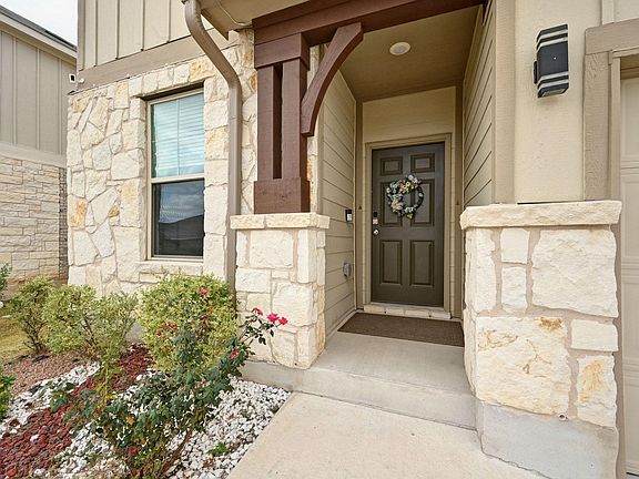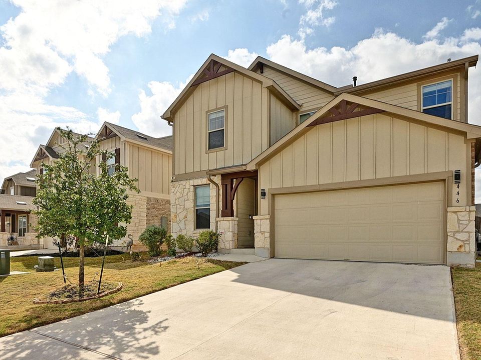 Immaculately maintained & filled with thoughtful upgrades, this pristine 5-bedroom 2.5-bathroom beauty offers an elevated living experience from the moment you step inside. Gorgeous brown luxury vinyl plank floors sweep across the 1st level, setting the tone for a warm yet upscale atmosphere. Just off the entry is a versatile dedicated office with French doors ideal for working from home and counted as one of the 5 spacious bedrooms. The open-concept floor plan seamlessly connects the living room & kitchen, making the heart of the home bright, inviting, & perfect for both daily living & entertaining. The kitchen feels straight out of a designer magazine with striking quartz countertops, gray cabinets with modern hardware, an island with pendant lighting, and plenty of prep & storage space. Upstairs, the primary suite delivers a peaceful retreat with a spa-inspired en suite bath featuring a large walk-in shower & expansive walk-in closet. 3 additional bedrooms, a loft, & a laundry room create room for everyone. The loft also offers access to a rare extra storage space a spacious closet perfect for seasonal items or holiday décor. Step outside to an oversized backyard with no immediate neighbors behind, giving you privacy & room to relax or entertain. To make daily life easier, a top-of-the-line refrigerator, washer, & dryer are all included. Located in the vibrant Sunfield community, residents enjoy unparalleled resort-style amenities, including an elementary school, walking trails, fishing ponds, on-site lifestyle activities coordinator, open-air pavilions, a splash park, a junior-size Olympic swimming pool, & 2 lazy rivers. Sunfield's prime location offers unbeatable convenience too! Just 3 minutes to IH-35, 5 minutes to the 130 toll road, & mere moments from shopping, dining, & everyday essentials. This isn't your typical rental this is a home that has been cared for, loved & upgraded with intention. Perfect for someone who values quality, comfort, & style!