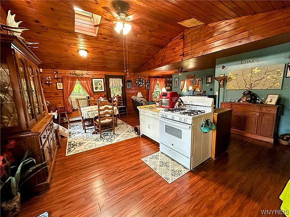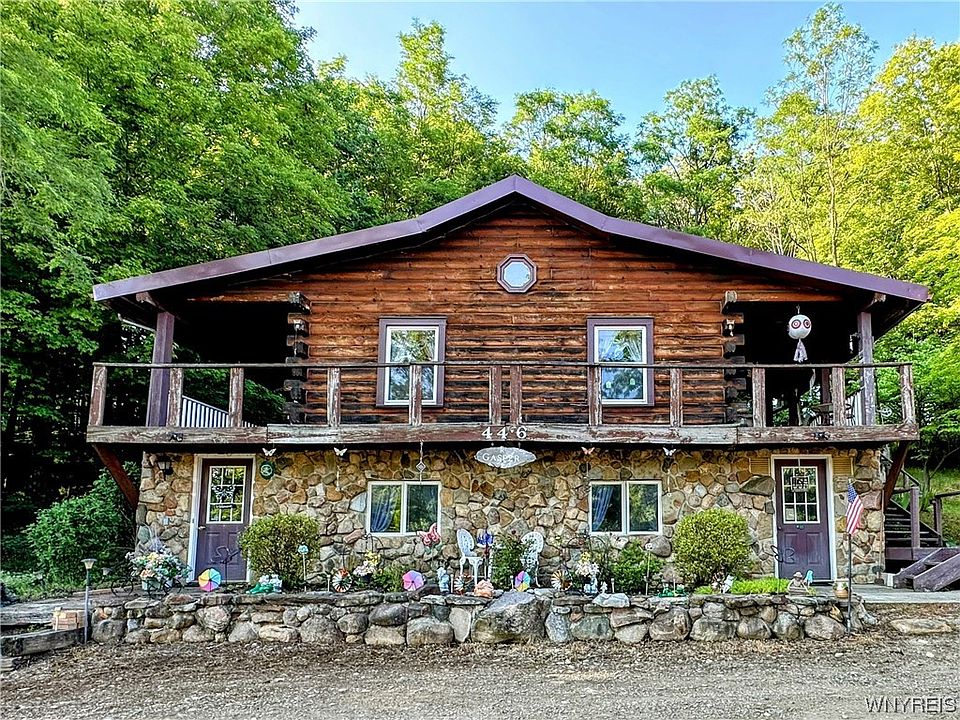 Welcome to your own Lincoln Log Home nestled on a 4 acre corner lot! This one owner well maintained home was custom built and designed with an open concept. Dining and living areas are open to the kitchen with all new bamboo flooring and multiple sky lights. Master bedroom with entrance to private deck. Heated walk out basement with 8 foot ceilings has multiple rooms for storage, entertainment, or additional living space. Three zone heating system, one for the bedrooms, the living room/kitchen/dining area, and the basement. 1200 square foot garage with full walk up attic, remote doors as well as a sliding barn door with man door in rear and attached car port for additional parking/storage. Wooded area behind home can also be accessed by driveway on Allegheny Rd, with the main entrance to the home on King Rd.
