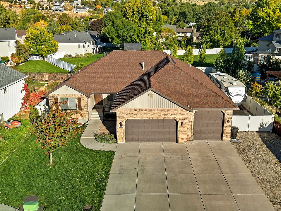 Located in the charming city of Springville, this well-built rambler offers spacious, single-level living with 1,918 sq ft on the main floor - perfect for both everyday comfort and entertaining. Built with quality 2x6 construction, this well-maintained home features 3 bedrooms and 2.5 bathrooms, with brand new carpet throughout. The open-concept layout includes a large kitchen with a generous pantry, a spacious dining area ideal for gatherings, and a cozy family room with a fireplace for those cool evenings. The primary suite is a true retreat, featuring a double vanity, dual shower heads, and heated floors in the bathroom for a touch of luxury. A recirculating hot water timer ensures instant hot water at all times. A generous mudroom helps keep the family's gear organized and out of sight, making everyday living more convenient. Downstairs, the full 1,918 sq ft unfinished basement offers endless potential - whether you're looking to add bedrooms, a home theater, gym, or custom retreat. Step outside to a covered patio and take in breathtaking mountain views. The fully fenced backyard provides privacy, beauty, and even a fruit-bearing peach tree. A new layer of asphalt shingles was recently added to the roof for extra peace of mind, and garage shelving is included for added storage. 3-car insulated garage and insulated garage doors with a 10-ft third bay door RV parking with clean-out an 16ft privacy gate and 30 AMP breaker. Covered patio with stunning mountain views House is wired for Christmas lights Fully fenced backyard with peach tree Convenient location near schools, parks, shopping, and quick access to I-15