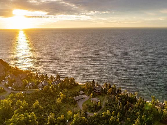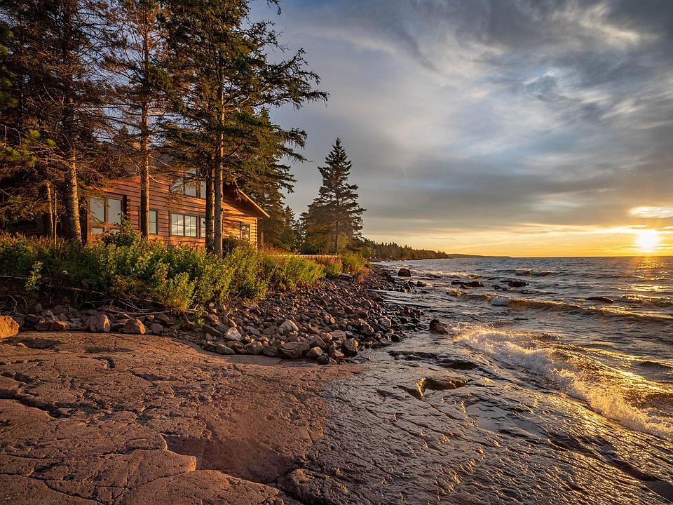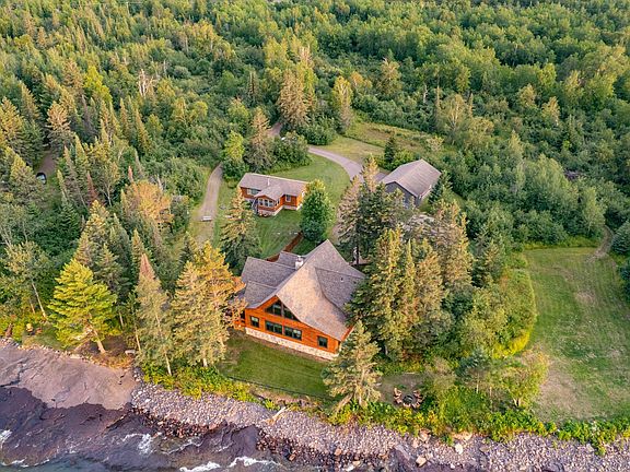 Beautiful custom log home with guest cabin 2 detached garages and a screen house at the waters edge. This home is stunning with a large kitchen withcenter island and beautiful custom cabinets, large living area with wood burning fireplace that overlooks Lake Superior. The main floor also has an office,bedroom, full bath and laundry area with ample of storage. Upstairs you will find the primary suite with large windows with stunning views, a reading nookand a bedroom. The property includes a 46x28 heated & insulated garage, a 24x24 garage, screen house just inches from the water, and a guest house.The guest house is 20x40 with a 12x12 sun room, a large king bedroom and a living/kitchen that looks to the lake. This 11 acre property is zonedcommercial/resort and can host rentals with the county.
