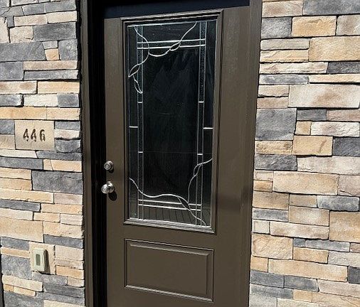 Fenced side lotWall of windowsExposed tubular ductsDark wood cabinetryStone front entryOpen main levelUnique triangular stone island