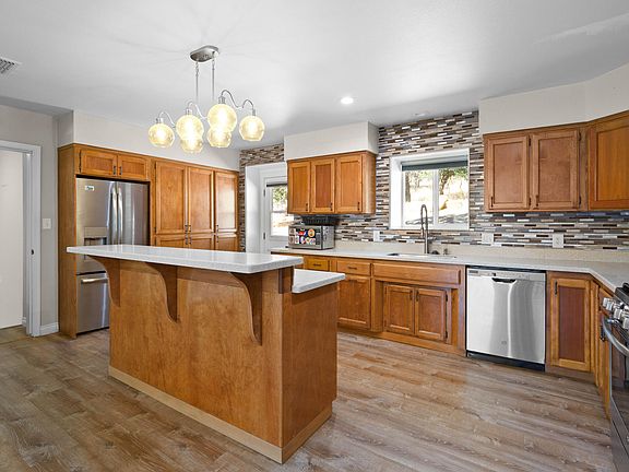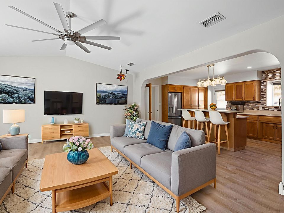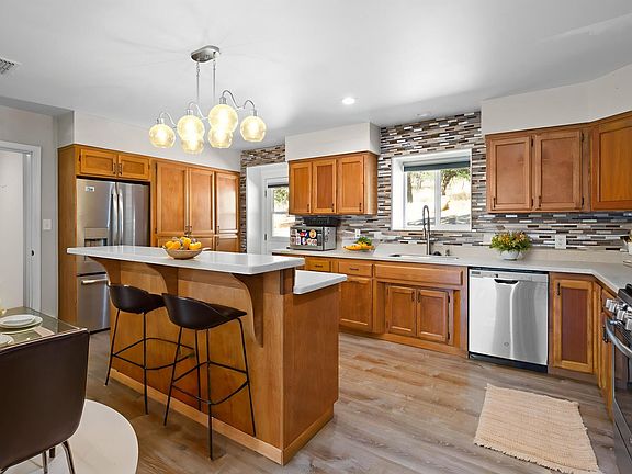 Experience the best of Jacksonville living! Just 7 minutes from historic downtown, the Britt Festival, boutique shopping, fine dining, and a scenic trail system. This refreshed straw bale ranch-style home features an open, vaulted floor plan with elegant arched doorways. The kitchen includes a spacious island with raised eating bar, solid surface counters with tile backsplash, ample cabinet and pantry storage, and stainless steel appliances. Spacious bedrooms offer walk-in closets. The primary bathroom features a double-sink vanity and walk-in shower, while the second bathroom boasts crisp white cabinetry, a granite vanity, and a soaking tub/shower combination. A cozy pellet stove warms the bonus family room, and a single-car attached garage completes this inviting home.