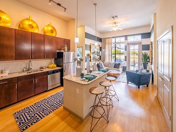 - Exterior features: , 12 Foot Living Room Ceilings, Business Center, Clubroom for resident event/party hosting, Deposit-Free Apartments, Energy-efficient, stainless steel appliances, Granite countertops and 42" European cabinetry, LEED certified community, On-site Relaxation Park, Package Receiving, Pet Friendly, Roman tubs in most units, Unique boutique hotel architecture, Virtual Community Tour, Virtual Floor Plan Tour, Walk-in showers in master bedrooms, Wood-style flooring