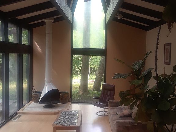 Custom built, single family ranch house, 1890 sf on a 0.48 acre wooded lot. 3 possibly 4 bedrooms; office/library space, 2 full baths. Large living room with retro fireplace. Updated kitchen with travertine countertops, high-end appliances, sandstone tile flooring . Maple hardwood flooring in living room, dinette. Large laundry room. 2 car attached garage and attached storage shed. Skylights and large windows provide lots of natural light. Decks on front, side and back.