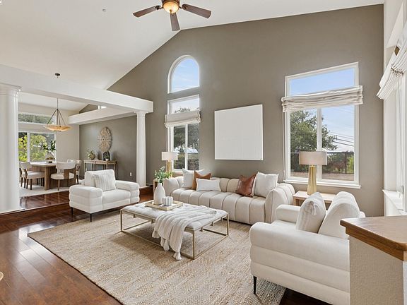 Located in a quiet cul-de-sac in the sought-after Prominence neighborhood of Hayward Hills, this stunning 4-bed, 3-bath home offers 3,045 sq ft of well-designed living space on a massive .37 Acre usable lot. The main level features a bed and full bath,plus a formal living room with soaring vaulted ceilings, a spacious dining room, and a large kitchen with stone countertops, a center island, gas cooktop, and wine fridge. The kitchen opens to a generous family room with an updated fireplace, and sliding doors leading to the beautifully landscaped backyard. Upstairs, the expansive primary suite overlooks the lush yard and includes a cozy fireplace, spa-like bath with jetted tub, dual vanities, and a large walk-in closet. Two additional bedrooms with high ceilings and a full bath complete the upper level.Enjoy the convenience of a main-level laundry room, a 3-car side-by-side garage, and a long driveway with room for multiple cars. Energy-efficient paid-off solar panels. The backyard is a true highlight; thoughtfully landscaped with multiple entertaining zones, a fire pit, greenhouse, and an incredible variety of mature fruit trees: plum, apple, lemon, almond, grapefruit, cherry, grape, pear, apricot, fig, pomegranate, lime, and orange.