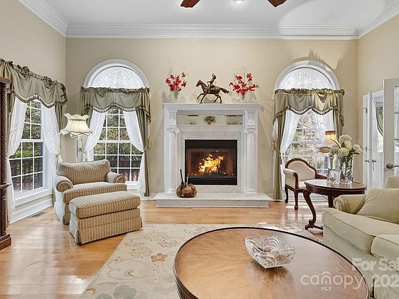 Gorgeous fireplaceCustom tudor revival homeTray ceilingCurb appealElegant architectural detailsMature landscapingGranite countertops