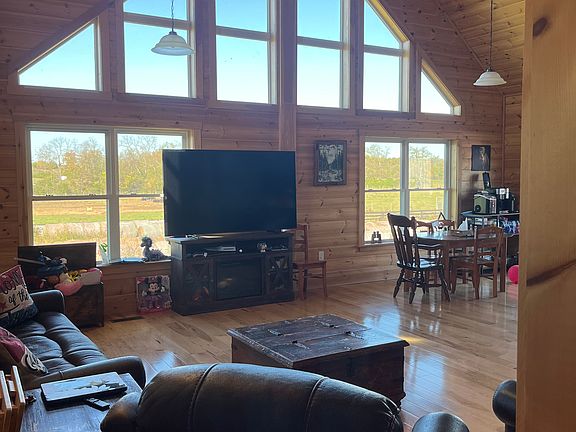 Chicken coopCustom-built log homeMain-level primary suiteStunning wall of windowsSweeping pastoral viewsFenced-in in-ground poolSoaring great room