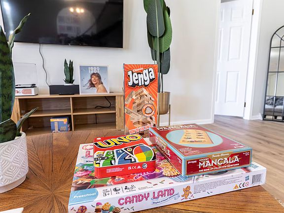This modern home is packed with fun basketball game, arcade, foosball, Jenga, and board games . Relax with a vintage record player and Taylor Swift vinyls, or smart TVs in every room. Enjoy a Nespresso & Keurig, a fenced yard.