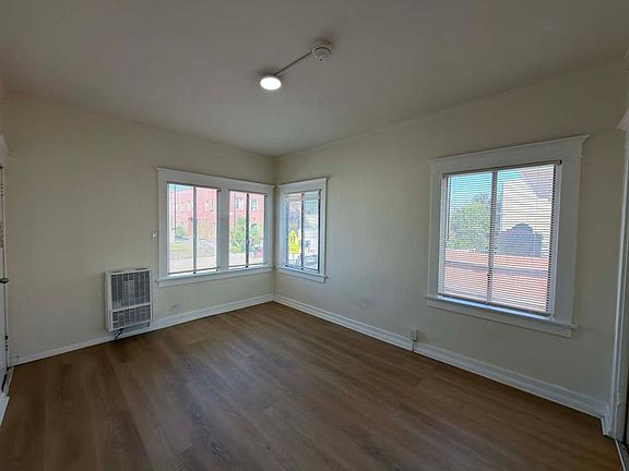 New paint and flooringCloset spacePractical kitchen with cabinetsPlenty of natural lightBathroom with a tub