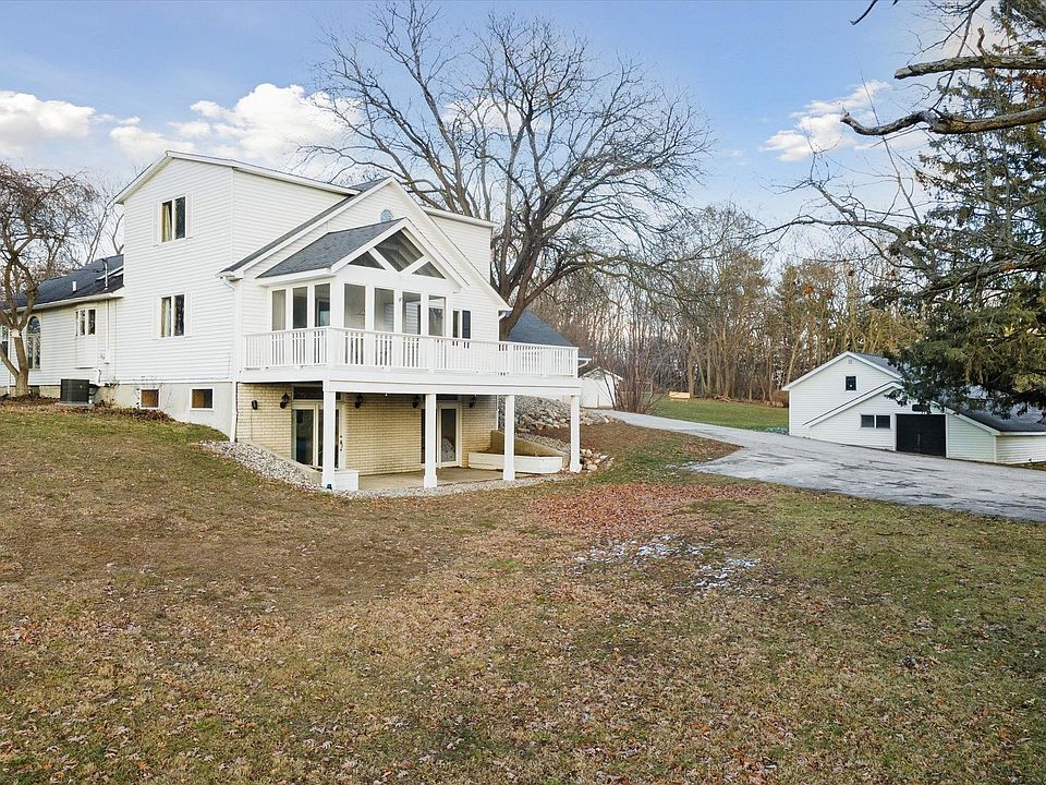 Welcome Home! This stunning 1850 built farmhouse, situated on over 4 wood acres on Kearsley Creek, was completely remodeled in the early 2000's. Home features first floor master suite complete with walk-in closet, sitting area, and private walkout to relaxing sunroom. Large eat-in kitchen boasts tons of storage space, walk-in pantry, and valuted ceiling with skylights. Beautiful archway leading to firelit family room with stained glass windows. First floor also features a formal dining room, office, and large laundry/mud room. 2 additional bedrooms and full bath on second floor. Basement is partially finished with a walk-out to covered patio. Additional detached garage. This home is move-in ready and ready for you to enjoy privacy with the luxury of being close to conveniences.