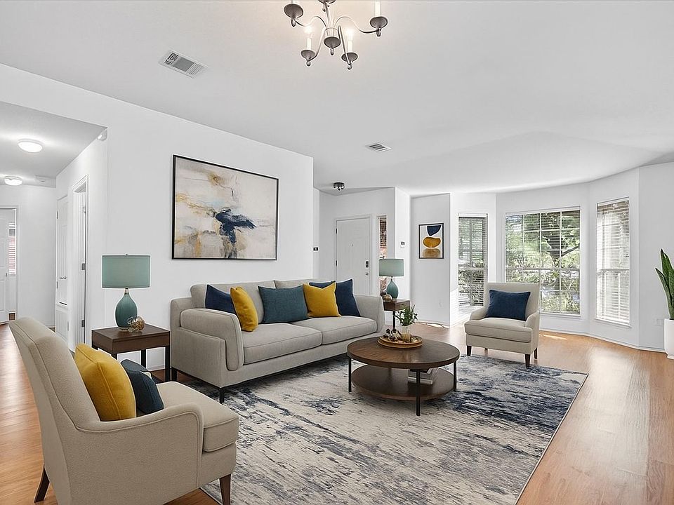 Cozy fireplaceBright open floor planSpacious family roomCovered back patioWalk-in closetAllergy-friendly carpet-free environmentDouble vanity