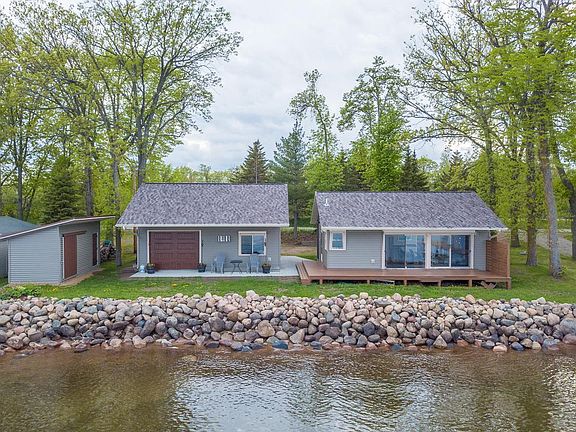 Panoramic Views of Mille Lacs! This stunningly crafted and designed lake home provides a panoramic view through its double 8' sliding doors. The main home with 2 bdrms, 1 bath, has vaulted ceiling in the living room and the modern kitchen with lake view windows. Each room has ceiling fans and beautiful vinyl panel floors. The Bunk House, in the detached garage, offers a 3rd bdrm and a separate laundry/utility room. Soak up the sun on the spacious lakeside deck, enjoy the lakeside patio with oversized eave off the bunk house or enjoy a morning coffee on the dock while watching the sunrise over Mille Lacs. Electronic hurricane shutters on two 8’ wide sliding doors and mechanical hurricane shutters on all other windows, including garage and bunk house.