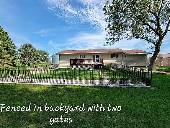 The acreage has 10.19 acres along with the house and several outbuildings. We built our home in 1983 with 2x6 stud walls and insulated for country living. It is placed between two local lakes. Wildlife roam the acreage with plenty of open areas for raising a family, animals, and a garden. The basement is partially finished with two rooms. Both rooms have walk-in closets. Plumbing is in place to add a full bathroom. The attached garage has a heater, ventilation fan, and a sturdy stairwell. A second garage is located near the house. The acreage can be accessed from both the east and the west on a paved road. There are two outbuildings located close to the house. One of these outbuildings has a heater and an attached kennel. The backyard has an outbuilding without electricity. It makes a nice playhouse or storage shed. The large Quonset is 60x48 is has a concrete floor and electricity. A storage unit located next to the Quonset is rodent and waterproof. Outbuilding 50x36 has two 12ft overhead doors with remotes, electricity, and the floor is gravel. Open shed 40x16 has electricity. Outbuilding by the bins has no electricity, but electricity is available at the bins. Also included are 5 bins with approximately 55,000 bushels of storage. Two are dryer bins. Amenities include rural water, satellite TV, mail delivery, school bus pickup and drop off. There is a 500 gallon propane tank located behind the house. The septic tank has a drainage field with easement in place.