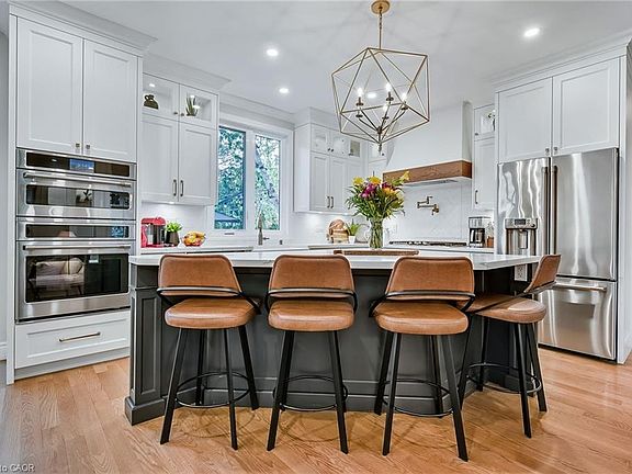Prestige, Luxury, and Lifestyle in Ancaster's Most Coveted Enclave. Set in one of Ancaster's most sought-after neighbourhoods-just steps from the iconic Hamilton Golf & Country Club—this freshly reimagined residence offers nearly 4,000 sq. ft. of refined living space where timeless design meets everyday comfort.The professionally designed chefs kitchen ('22) is the showpiece of the home: custom full-height shaker cabinetry with glass-lit accents, quartz counters, a charcoal island with brushed bronze fixtures, gas cooktop with pot filler, farmhouse sink, custom range hood, and herringbone style backsplash. Wide-plank hardwood floors and designer lighting complete this entertainer's dream. Main-floor highlights include a bright executive home office, elegant wainscoting, and an inviting flow that balances open concept with defined living spaces. Upstairs, four spacious bedrooms provide plenty of room to grow, while the primary suite feels like a boutique hotel retreat: Moroccan-inspired marble tile, walk-in glass shower, and dual vanities ('20). The fully finished lower level adds flexibility, with a 5th bedroom, full bath, and generous rec space—perfect for guests, in-laws, or an independent teen. Step outdoors and discover a backyard built for memory-making: a sparkling saltwater pool with a brand-new liner ('25), built-in play structure, and a fully fenced yard that offers both privacy and peace of mind. Families will appreciate proximity to top-ranked public and Catholic schools, with extracurricular programs, parks, and trails nearby—making this not just a home, but a foundation for a connected, active lifestyle. This is more than a house. It's an Ancaster lifestyle statement—design-driven, family-forward, and move-in ready in one of the city's most prestigious