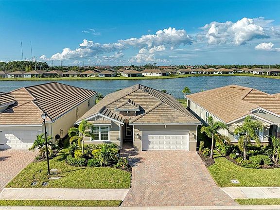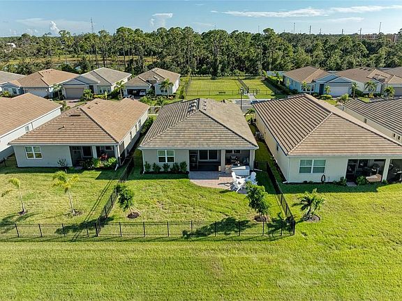Nearly NEW Home without the new construction price tag & fees! Gated, Central & LOW LOW HOA! Welcome to this stunning 2023 Delray model, located in the boutique, gated community of Palencia. IMPACT WINDOWS. Offering over 2,000 sq. ft. of living space, this 4-bedroom, 2-bath home is in pristine condition and filled with natural light thanks to its desirable southern exposure. Step inside to find a true split floor plan with two guest bedrooms up front, an additional guest room (perfect for a home office or den), and a spacious master suite tucked privately at the back of the home. The master features dual walk-in closets, dual sink vanity with quartz countertops, frameless glass shower with floor-to-ceiling tile, and a private water closet. The open-concept kitchen flows seamlessly into the gathering and dining rooms. Enjoy a large quartz island, subway tile backsplash, custom pendant lighting, soft-close cabinetry with pull-out drawers, and wide sliders showcasing long water views. Outdoor living is a highlight here: a covered and screened lanai plus an extended paver patio overlook the fully fenced backyard, offering ample room for a future pool. Additional features include a widened driveway, 8' doorways, wood like tile flooring, full glass front door, custom upgraded lighting, epoxy garage flooring and a spacious laundry room with shelving and utility sink prep. Palencia is a boutique community of just 203 homes, with low HOA fees that cover lawn maintenance, gated access, and community amenities – and no CDD fees! Palencia has a resort style community pool, clubhouse, bocce ball courts, dog park, and fitness center. Ideally located near the Legacy Trail, nature preserves, restaurants, and shopping.