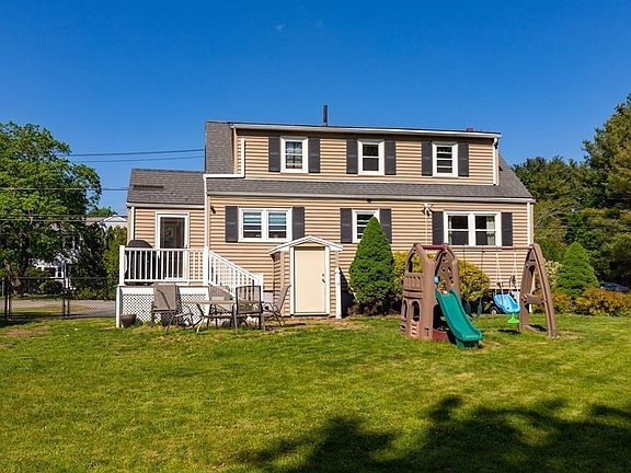 Open and spacious Cape located on a side street corner with easy access to highway, shopping and within a mile to the beach! Bright and sunny home offers a Kitchen with bar and open to the large dining area with an accent wall of wood, plus added eating area in the enclosed 3 season porch. Hardwood floors on two levels. Bright and sunny Living room has a fireplace, large picture window and is open to the playroom or expanded living room area! Main level full bath with ceramic tile floor plus a newer 2nd floor bath has ceramic tile 3/4 shower, floor and newer vanity! 2nd floor offers front to back primary bedroom plus 2 additional bedrooms or potential 2nd floor laundry. Lower level is finished with a family room, office and lots of storage closets including a cedar closet. Enjoy entertaining on the deck overlooking the large level fenced yard with a large shed for extra storage! Gas heat, hot water and stove! Central air on the main level and basement. Mini-Split unit upper level.
