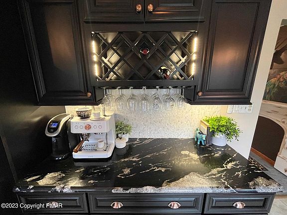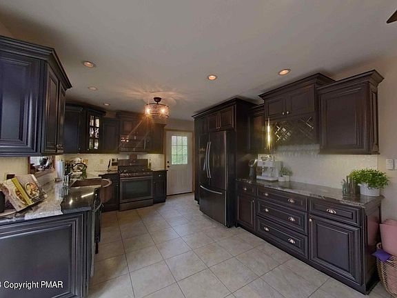 'Property is Under Contract and considering back-up offers only at this time.' This stunning peaceful, 3 bedroom, 2.5 bath home is nestled in the desirable Pocono Mountains is a rare gem. With its tranquil woodland forest surroundings and serene community, it offers the perfect escape from the hustle and bustle of daily life. The open concept first floor boasts ample living and entertainment space, including huge windows to enjoy panoramic views of nature and the diverse wildlife it beholds. The calm front porch and beautiful back deck offer distinct spaces for enjoying nature and taking in the starlit skies on clear nights. The recently remodeled interior showcases a unique blend of rustic and modern elements, with original oak flooring in the dining room and a chic, professional eat-in kitchen featuring stunning Italian granite stone countertops, mother of pearl backsplash, copper farm house sink, and black stainless appliances. The thoughtful design also features three large private rooms with closets, including a spacious master suite and guest suite with attached full bathrooms. The powder room and laundry/mudroom on the first floor provide added convenience and functionality. This home is truly a sanctuary for living, relaxing, entertaining, and gathering with loved ones. Don't miss out on the once in a lifetime opportunity to make this peaceful retreat your own - schedule a tour today!