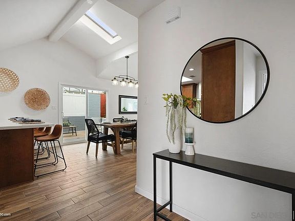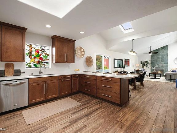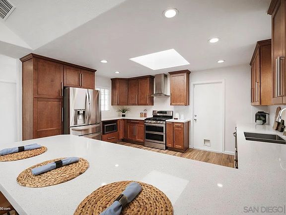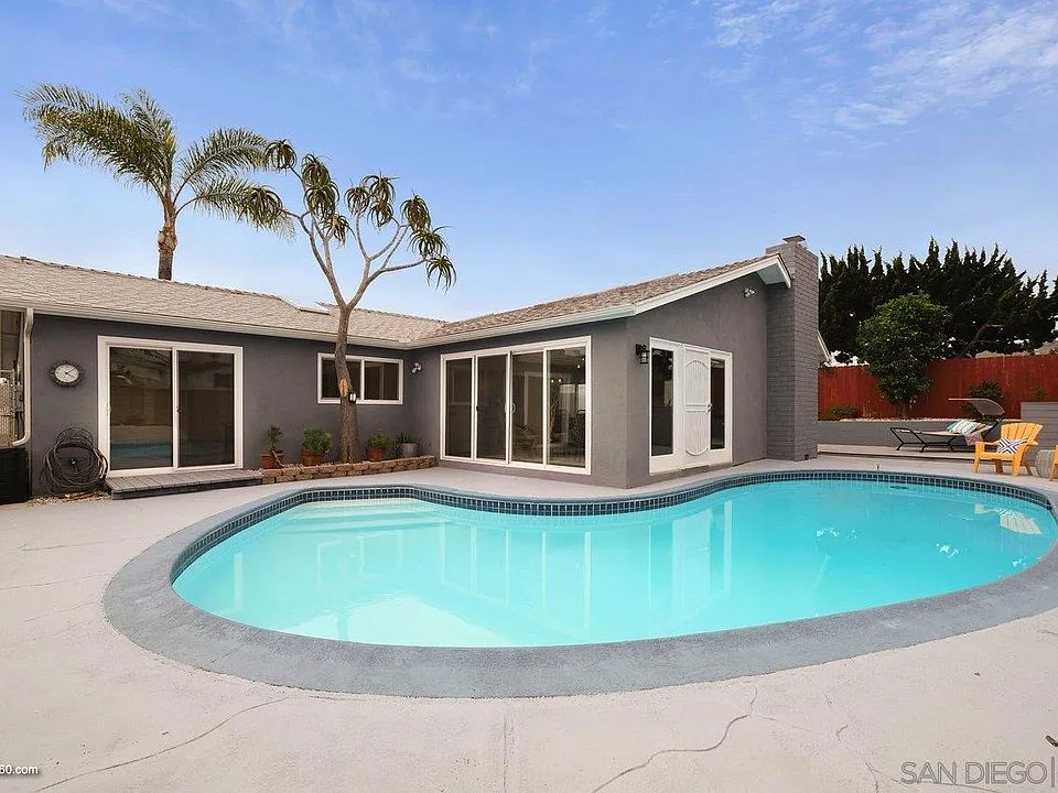 Welcome to this stunning single level North Clairemont 3 bed 2 bath home. Updated floor plan provides open layout, vaulted ceilings, cozy family room fireplace and skylights for lots of natural light. Spacious kitchen with quartz counters, soft-close wood cabinets, SS Appliances, tile back splash and porcelain tile throughout. Enjoy your backyard paradise with heated pool, citrus trees and trek decking to host family gatherings. Save on energy costs with brand new roof, dual pane windows and paid off Solar. New HVAC and tankless water heater along with drought tolerant landscaping. The side of home offers covered RV or Boat Storage. Home is conveniently located near shopping centers and restaurants. Enjoy easy access to nearby freeways which makes commuting a breeze.