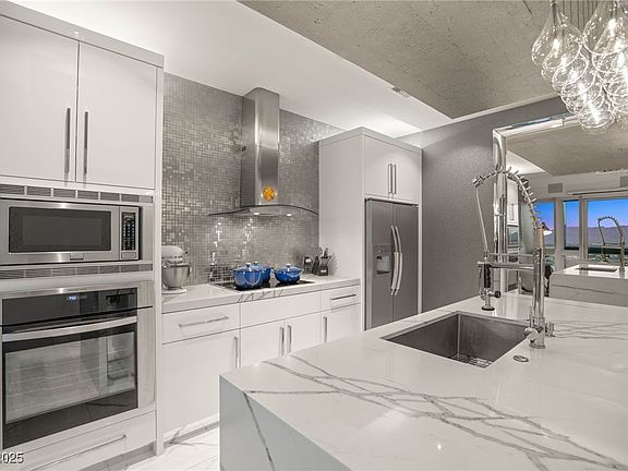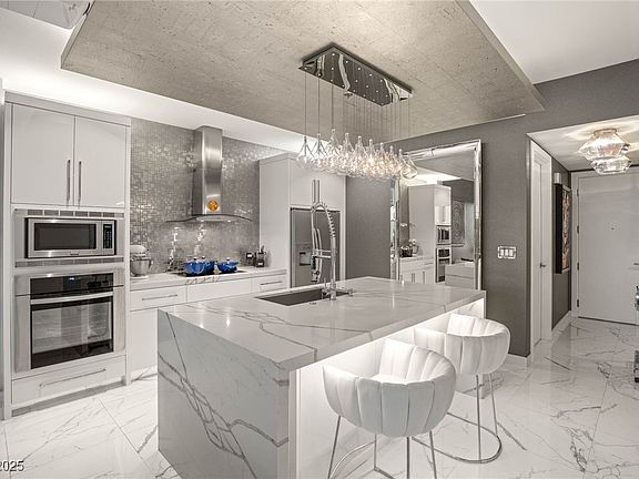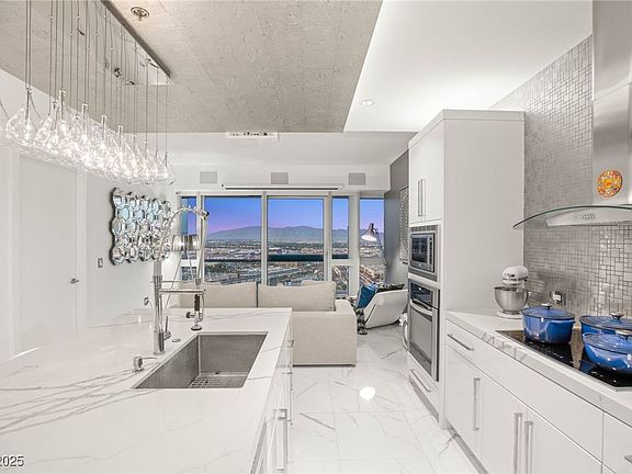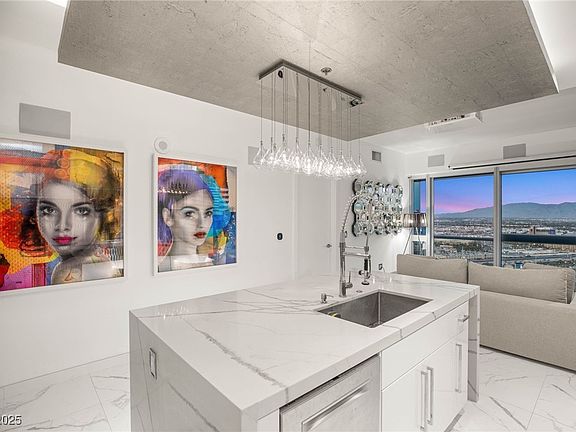 Sophisticated luxury soars above the Las Vegas skyline in this spectacular 37th-floor residence at The Martin! Professionally remodeled and re-imagined, this 2BD/2BA designer showplace blends high style with smart-home innovation. Enjoy mesmerizing north-facing views of the Strip and mountains through floor-to-ceiling glass. Every detail delights with custom stone flooring, cabinetry, and wall finishes, built-in surround sound, and full smart-home control of lighting, blinds, music, and temperature. The primary suite dazzles with designer chandeliers, rainfall shower, blackout blinds, and 77” OLED TV. Entertain with a retractable 90” movie screen and rebuilt stone island kitchen featuring Bosch and Frigidaire appliances. Guest suite with chandelier lighting and rainfall shower. The Martin offers world-class amenities including concierge, valet, resort pool, spa, and fitness center, just moments from the finest dining and entertainment on the Las Vegas Strip!