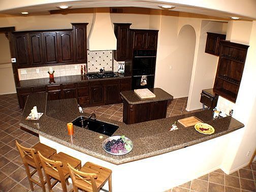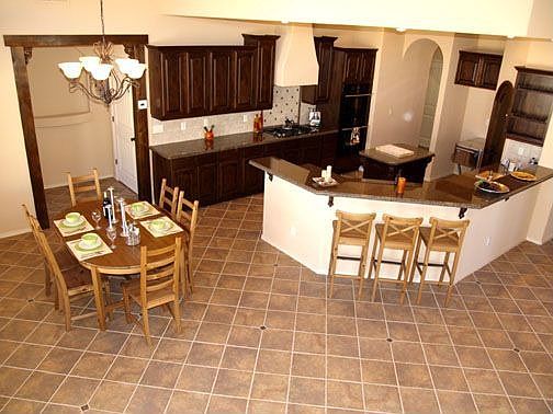 - Kitchen: Eating Area, Breakfast Bar, Electric Range, Tile Floor, Built-in Oven/Range, Custom Built Cabinets, Pantry, Built-in Dishwasher, Microwave Oven, Vent Fan, Wood Cabinets, Granite Counters, Gas Cooktop