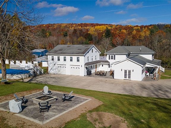 MOTIVATED SELLERS, RELOCATING! You want it! This home has got it! Check everything off your list! Up, up, the concrete driveway to this stunning home on a nearly 5 acre partially wooded, secluded parcel w/ a creek and pond. Entertain your guest on the large centrally located patio, sit around the firepit, or take a dip in the pool, or maybe rocking on the wrap around covered porch w/skylights is more your thing. No gathering too big for this absolute jaw-dropping kitchen/family room w/soaring ceilings, heated custom tile floors w/mosaic, ten-foot central island that seats 6 also houses 1 of 2 ovens, wine chiller and cooktop. More formal gathering? Use the formal dining rm/ living rm. Upstairs: central balcony overlooking the backyard, 3 bedrooms including the master w/en suite bath. Beautifully remodeled bedroom suite in the basement with walk-in closet and full bath, fun accent wall, ceiling, and barn style doors. Not done yet! Home includes a large in-law suite, kitchen w/island, custom stone, gas fireplace, full bath, access to the balcony and rear egress to the pool and patio. This home has radiant heat throughout including the attached oversized two car garage w/second laundry and bath. It's going to WOW you.