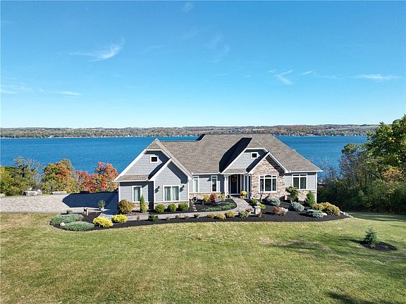 OPEN HOUSE: 1-3 pm Saturday, October 18. Welcome to “Blue View!” Custom built 2017 residence with stunning panoramic Canandaigua Lake views, single level convenience, plus added realms for family and friends. Main floor primary suite with lake views, walk-in closet, luxury bathroom, and door to a large deck overlooking the lake. Two additional main floor bedrooms with full bathroom. Lake facing, upgraded, chef’s kitchen with white cabinetry, quartz counters, high end appliances, large island with breakfast bar, walk-in, custom pantry, plus dining area that opens to the vaulted ceiling Great room featuring the wood accented, gas fireplace & built ins. Upgrades galore: 10 ft ceilings throughout, 8 ft paneled doors, transom windows, hickory hardwood flooring, radius corners…nothing but the best! Mezzanine level offers two additional lake facing bedrooms including bunk room with a special play area and an ensuite bedroom. Other rooms on mezzanine level provide options for an office, exercise room, workroom & storage space. For some added fun, the terrace level includes a pub-style wet bar with a 12-foot live edge maple bar top, refrigerator & dishwasher, and adjacent areas with 3 TVs, fireplace, dining area & golf room with Skytrak simulator system. Enjoy the outdoors with spacious decks, stamped concrete patio, attractive paver driveway, and professionally landscaped 1.9 acres setting adjoining woods. Attached 3 car finished garage, all public utilities: gas, water, sewer, high-speed Internet. Sq ft per appraisal. Low-maintenance composite decks and vinyl shake siding. Conveniently located in the the Heart of the Finger Lakes Region near downtown Canandaigua amenities, marina with boat launch, Onanda Park for swimming, kayaking & hiking, Bristol Mountain Ski Resort, Wegmans, CMAC, wineries, festivals!