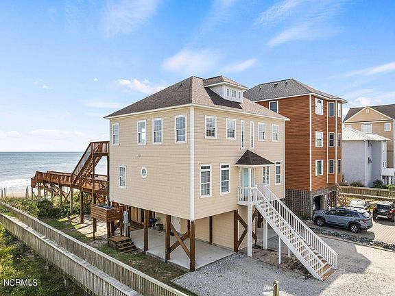 Stunning oceanfront home in North Topsail Beach! Hard to find 5 bedroom + 5.5 baths makes for the optimal vacation home or investment property. No HOA! Kitchen boasts white shaker cabinets, subway tile backsplash & granite countertops. LVP flooring throughout. Huge, updated master bathroom. Enjoy the gorgeous ocean views from your kitchen/family rooms & breathtaking sunrises from your top deck jacuzzi or lower deck seating. Outdoor shower and storage area. Plenty of parking with room for 4 cars under the house + extended driveway for many more. New roof & HVAC's. Home sold fully furnished. Fantastic rental potential with current owner grossing close to 100k in 2024 while leaving plenty of weeks for personal use. This home is move-in ready and one of a kind.