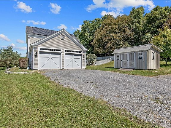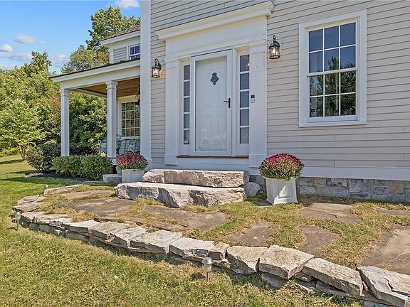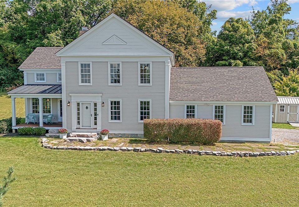Classic American Home on 6.7 acres with sweeping views. Welcome to this mill built architectural gem featuring 4 bedrooms, 2 1/2 baths and 2342 sq. ft. of thoughtfully designed living space. Nestled on 6.7 acres, the property is a nature lover's paradise with wooded walking trails, a creek, raspberry bushes and endless opportunities for birdwatching --- all framed by spectacular sunsets and panoramic views that stretch for miles. Step inside to an extra wide foyer with built-in seating. Natural light fills the comfortable family room. The formal dining room opens directly to the pergola covered patio and fenced backyard. The beautifully appointed formal living room features a woodburning fireplace, flanked by custom bookcases with access to the charming covered front porch and stunning exterior detailing. The fully applianced eat-in kitchen is designed for everyday living and entertaining and features a huge central island, abundant cabinetry, pantry and convenient mudroom with tile floors, Dutch door and laundry hookup. A second laundry area is located in the basement which also provides an abundance of storage. Upstairs you will find four spacious bedrooms with large closets, two full baths and a new master shower. Wide pine floors and transoms over doors and windows add timeless charm throughout both levels. Additional highlights include: oversized two car garage with access to storage space. Handy 10x14 storage shed. Recently installed air conditioning. Stone patio and fenced backyard. Plantation shutters in the main level and primary suite. A short 15 minute drive to Skaneateles, Syracuse University and Hospitals. This beautifully maintained home blends classic American architecture with modern updates offering space, character and a setting you'll love to come home to.