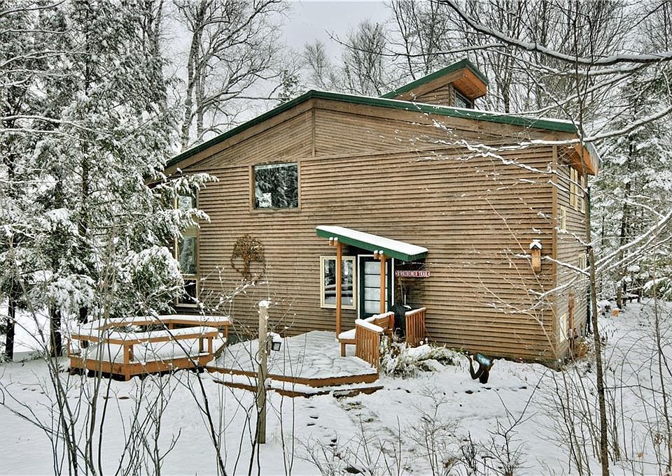 Modern artsy feel on beautiful small lake. Close to Lake Namekagon, down a quiet wooded road this cabin is surrounded by towering trees with floor to ceiling windows overlooking the lake. In the winter, curl up with a good book by the wood burning fireplace; summer time would be perfect for kayaking or hiking in the woods. This cabin features 3 bedrooms, 2 baths and a 2 car garage and is so funky and fun you will sure to enjoy every minute you are there.