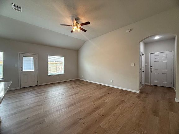 The outside features a very large covered back patio with ceiling fan for those Texas nights and no backyard neighbors! Large two-car garage, xeriscape front yard, and irrigation system, adds to the appeal of this home.