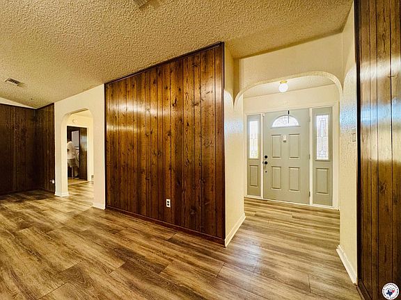 Large corner fireplaceFormal dining roomArched doorwaysCovered back porchGallery style entry