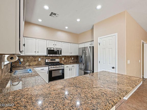 Move-in ready home with a large backyard and built-in BBQ surrounded by trees and vegetation. The kitchen features granite countertops and stainless steel appliances. The first story floor and stairs have tile throughout, and the bathrooms have tile countertops. The primary bedroom includes an en suite room that can be used as large walk in closet or living area. Downstairs offers plenty of living space with a great room and a den. Residents can also enjoy the recreation center, pool, splash pad, and lake that Rancho Sahuarita has to offer! VA assumable loan at 2.75% rate.