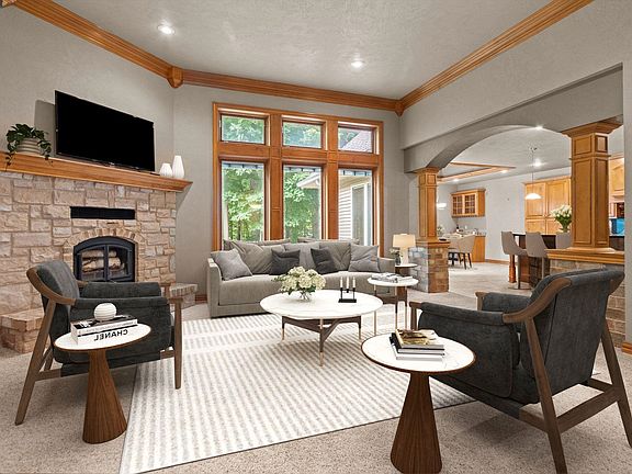 Well-maintained no-step home on a wooded cul-de-sac lot with brick exterior. Spacious kitchen with maple cabinetry, large island, Viking-style range, and two pantries. Large deck overlooks trees. Primary suite includes whirlpool tub, tiled shower, dual vanities, and brick detail. Great room with wood-burning fireplace, sitting room on main, and dedicated office off foyer. Finished lower level includes 9-ft ceilings, cedar closet, and finished bar with dishwasher and fridge. 400-amp electrical. Recently deep cleaned and ready for new owners.