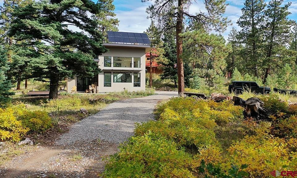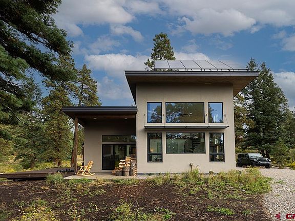 ~~ Experience the unexpected!! This striking contemporary cabin is tucked back in the woods on 3 acres … yet only 10 minutes (less than 5 miles) to Purgatory resort. Feel immersed in nature but with quick access to resort amenities, and plentiful trails in the nearby Forest Service and Weminuche Wilderness. The 220 degree views, through the surrounding trees, encompassing the Hermosa Cliffs around to the Needles Mountains, including the 13,970 foot Pigeon Peak. ~~ The layout is stylish in its simplicity …. All dominated by the great outdoors! The 960 sf home lives big. Full height energy efficient windows in the living room, from floor to 17 ft vaulted ceiling, provides immense southern exposure and passive solar gain warming the attractive stained concrete floor. The lay out is open to the kitchen with a stunning river-cobble, smooth granite countertop. And gives access to a both a covered grill porch and large west facing deck for lounging and sunset views. The modern full bath is also on the main floor. Plus access to the single car attached garage, which also has in-floor heat. Upstairs is a huge open loft with handsome hardwood oak floors and big doors going out to an east facing deck for sunrise over the mountain peaks. ~~ The electricity for the home is provided by 12 solar panels and a state-of-the-art Outback inverter with accompanying battery storage. As back up there is a propane 12 KW Kohler generator, rarely used. How about not having an electric bill?! Heat is in-floor radiant, on both the main floor of the house and garage, supplied by a high-efficiency propane Lochinvar boiler that also delivers the domestic hot water. The septic system was built to accommodate a three-bedroom home and the subdivisions covenants allow for a second dwelling. Sample the delicious cool, clean well water from 460 foot deep. Lakewood Meadows Road Maintenance plows and maintains the roads for the $400. annual fee, there is no active association. ~~ ~~ Imagine waking up in this peaceful retreat having coffee on the upper deck watching the sun rise. Going out for a hike, bike, climb or ski in this playground you call home and coming back to relax in the hand-crafted wood burning outdoor sauna watching the wildlife pass through. Aaaah – own a bit of paradise!