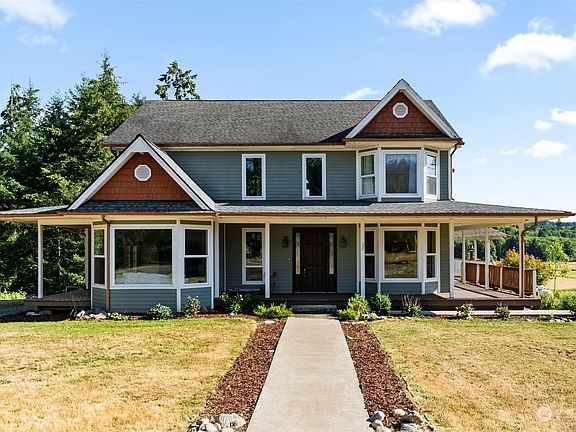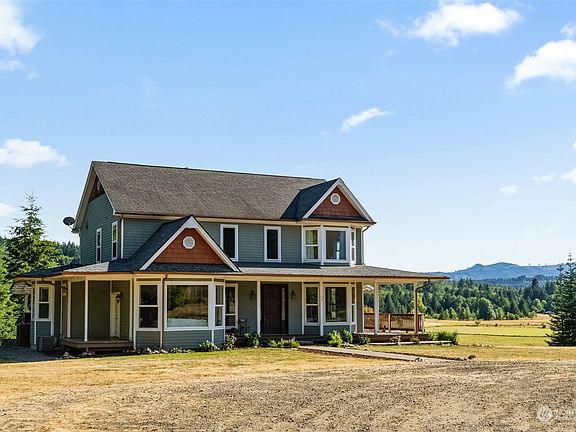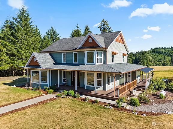 Experience incredible views, nearly 30 acres of land, and a beautiful home in the Pacific Northwest. The custom farm-style kitchen, with bar seating and a stream-fed pond view, features a new stainless gas range and dual oven. This three-story home has 5 bedrooms, including two primary suites on the first and second floors with large tubs and walk-in closets. Upstairs, two bedrooms share a full bathroom and balcony. The great room, with its dome ceiling and panoramic views, has a cozy propane fireplace and back deck access. An office with a private porch, a half bath, and a daylight basement with rental potential complete the space. The property includes fenced pastures, outbuildings, Airbnb potential, and a man-made pond.