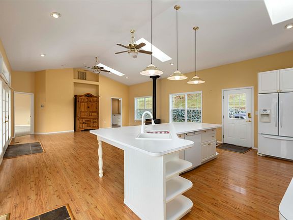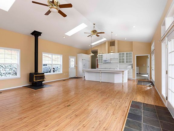Two bedrooms are located from one entrance on the top driveway. There are two bathrooms up there as well. On the lower floor, you can enter through the bottom driveway. It has a large room/bedroom or office with cabinets/closets as well and it's own bathroom. Next to this room is a large Garage that previous owner has made his workshop. Great desk, private office and woodstove make it an excellent place to store cars and do some work. Great well on property and clean water. We have a current appraisal already prepared and this home would make an excellent air bnb. Open spacious and wrap around decks ,such a great place if you love the views.