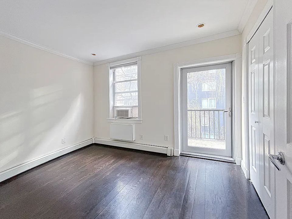 Oversized windowsExposed brick wallsRecessed lightingPrivate balconyCrown and baseboard molding