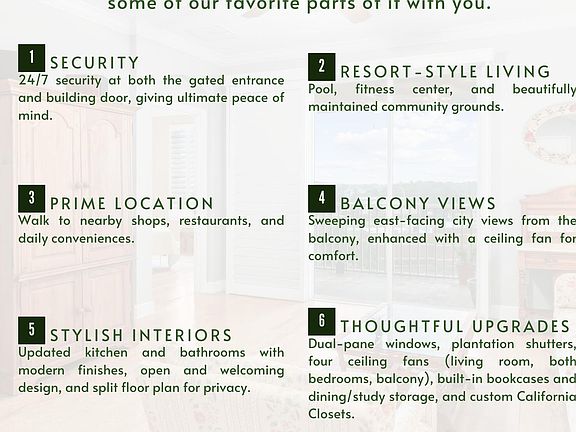 Dedicated officeFlex spaceExtra finishesBeautiful city viewFormal diningPlantation shuttersCalifornia closet system