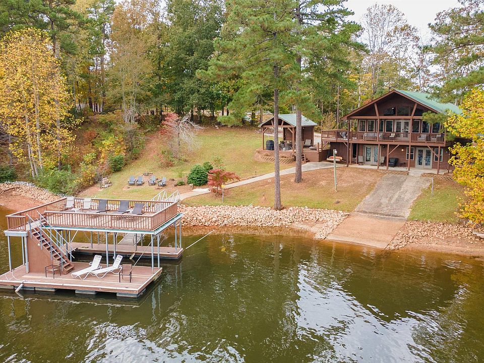 One-of-a-kind lake property! This one boasts 374 feet of year-round water with a very gentle slope. Situated in a great location, just a short boat ride to the new marina. The recently updated cabin offers amazing lake views. Upon entry, you'll notice an abundance of windows offering natural light and panoramic views. The kitchen features granite, stainless appliances, and custom cabinetry. The main level has hardwoods floors and a wood vaulted ceiling. The full bath on the main features a tile shower and tile flooring. The fully finished basement offers three bedrooms, and a full bath. The primary bedroom is spacious and has double doors leading to the lake. Outside, enjoy the lakeside lifestyle with a gazebo that includes an outdoor kitchen, a firepit area, and a very gentle walk to the water. The double-decker floating dock offers a boat slip, storage room, and a large sundeck. The community boat ramp is accessible year-round and within walking distance. Sought after property!